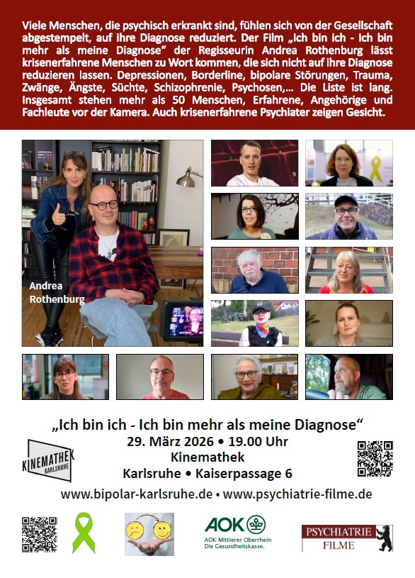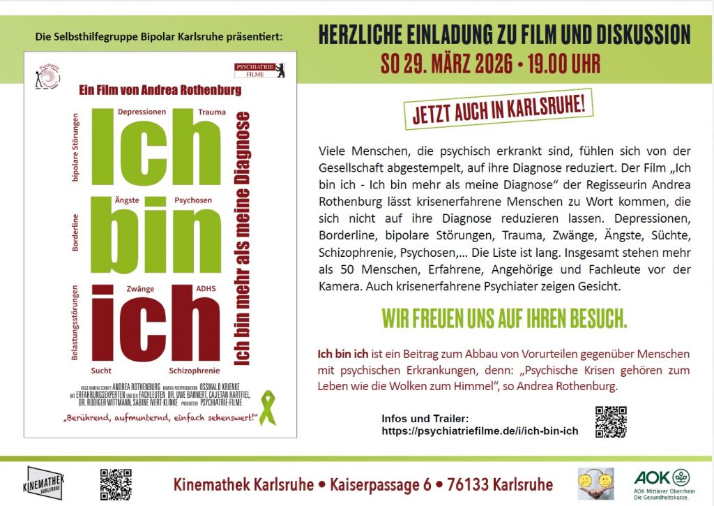 Am Sonntag, den 29. März 2026, um 19:00 Uhr zeigt die Selbsthilfegruppe Bipolar Karlsruhe in der Kinemathek Karlsruhe den Film Ich bin ich – Ich bin mehr als meine Diagnose von Andrea Rothenburg.